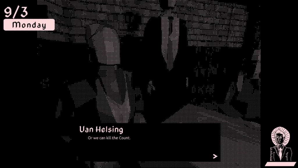 Cutscenes show both journal entries by characters, keeping with Dracula’s style, and traditional visual novel dialogue scenes. BYTE is all about the clash between 19th-century Gothic and 20th-century technology, so retaining the literary style of the novel is a core part of the experience.